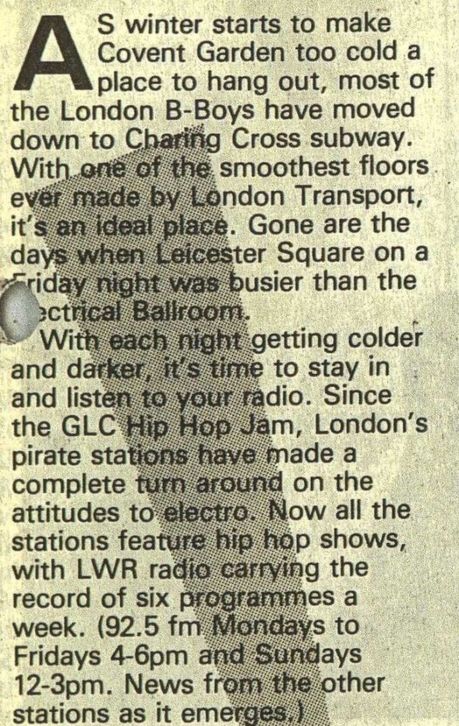 The music is good too, the full tracklisting is below but you’ll hear ‘jamdown’ tunes from Run DMC, BB Fresh, Jazzy D, Cutmaster DC, Master Gee, Craig G, Doug E Fresh and the Queen of Rox, Shante [Or as Timothy puts it, Roxanne Shanty. Did he think she was a sailor] ? There’s a brief interview with Bambaataa and a short live set from The Wag, featuring The Fat Boys, ‘all aged 17 but together they weigh 52 stone’.